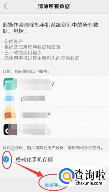 进入之后,选中“格式化手机”,然后点击“重置手机”,进入下一界面。