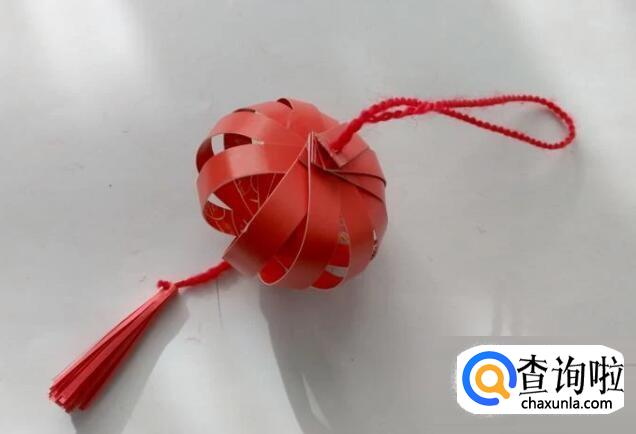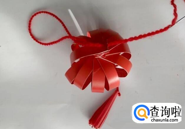 最后把剩下的红线从最上面的灯笼条中穿下来,留在灯笼上面约10厘米的挂线后打结固定并剪掉多余的长度,圆形灯笼就做好了。