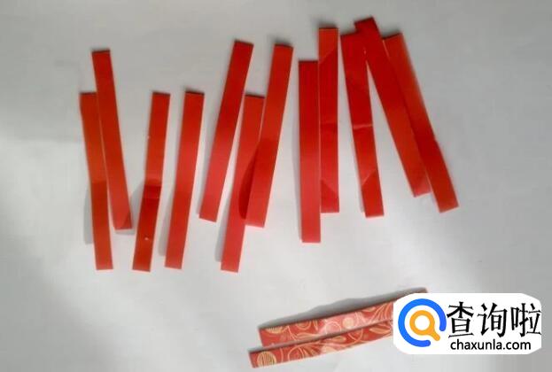 用剪刀将红包剪出红包条,每条的宽度要一致,然后两面都有图案的竖条捡出扔掉,共留下12个竖条备用。