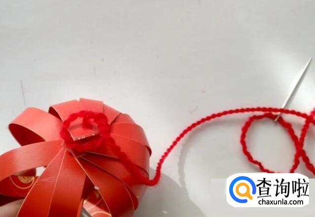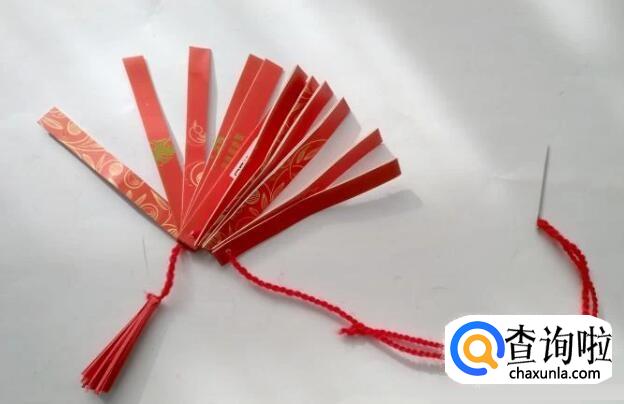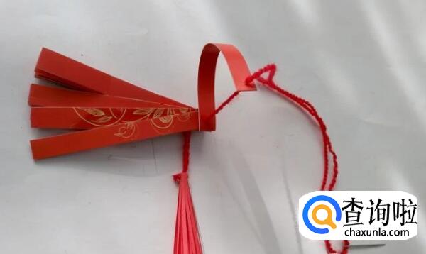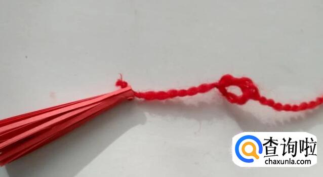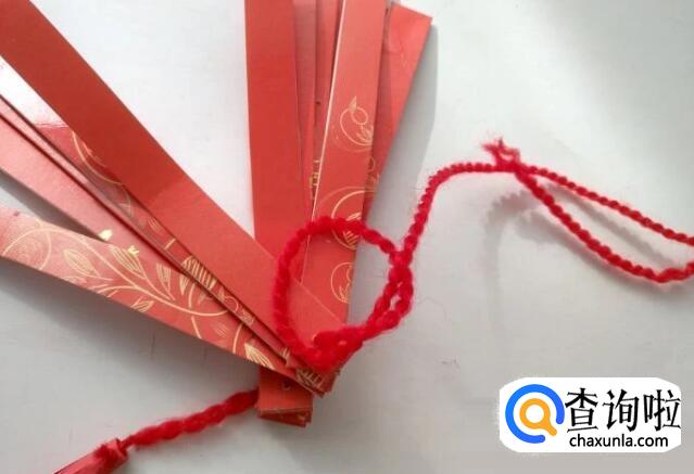 用红线把穗头穿起来,然后在4厘米左右的上方打个结,以便固定灯笼条。