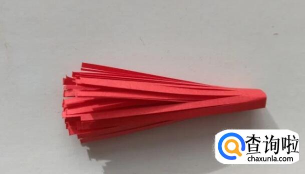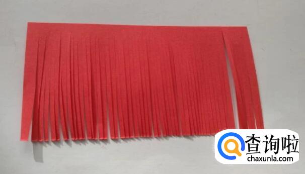 把红色长方形纸剪出下图这样的竖条,注意顶端不要剪开,然后把剪好的长方形卷起来,穗头就做好了。