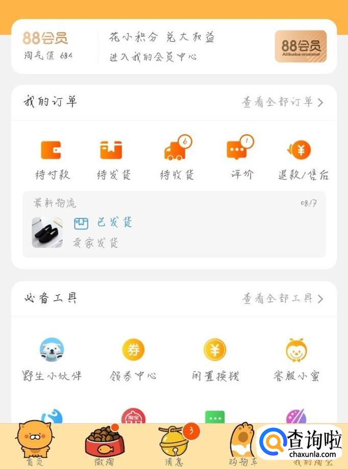 打开淘宝以后我们可以在页面的右下角看到“我的淘宝”,点击“我的淘宝”,然后我们就会在个人主页看到“查看全部订单”。