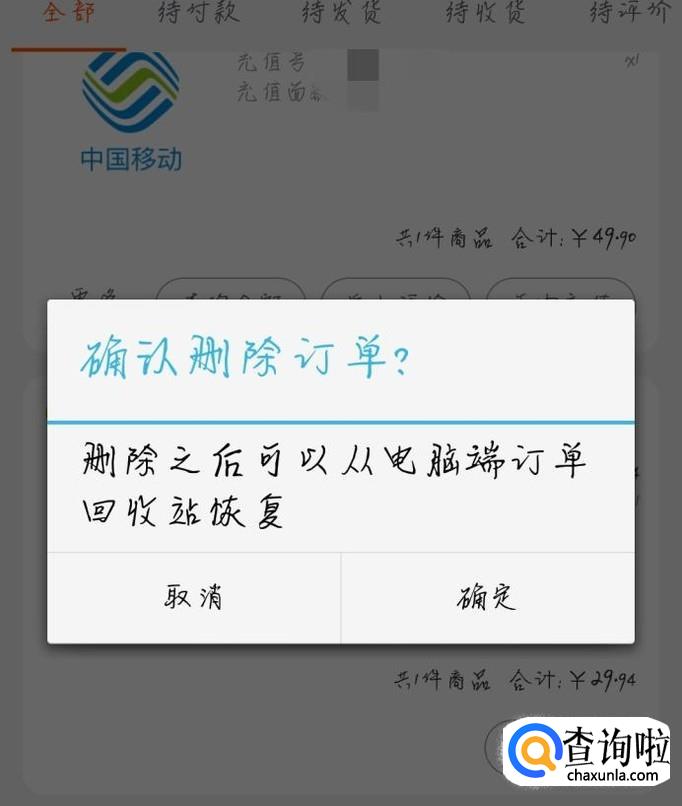 我们可以看到在订单的右下角有一个“取消订单”,点击“取消订单”,然后就会出现一个确认取消订单的提醒,点击“确定”,订单就成功取消了。