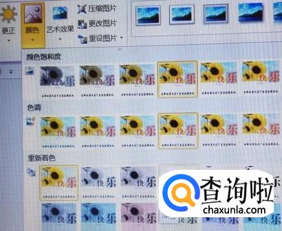 点击颜色按钮进入颜色设置,在弹出的颜色设置框中找到“重新着色”那一栏,然后在重新着色那一栏里找到名为“冲蚀”的效果图片,点击这张图片,然后你的图片就设置成了冲蚀效果啦