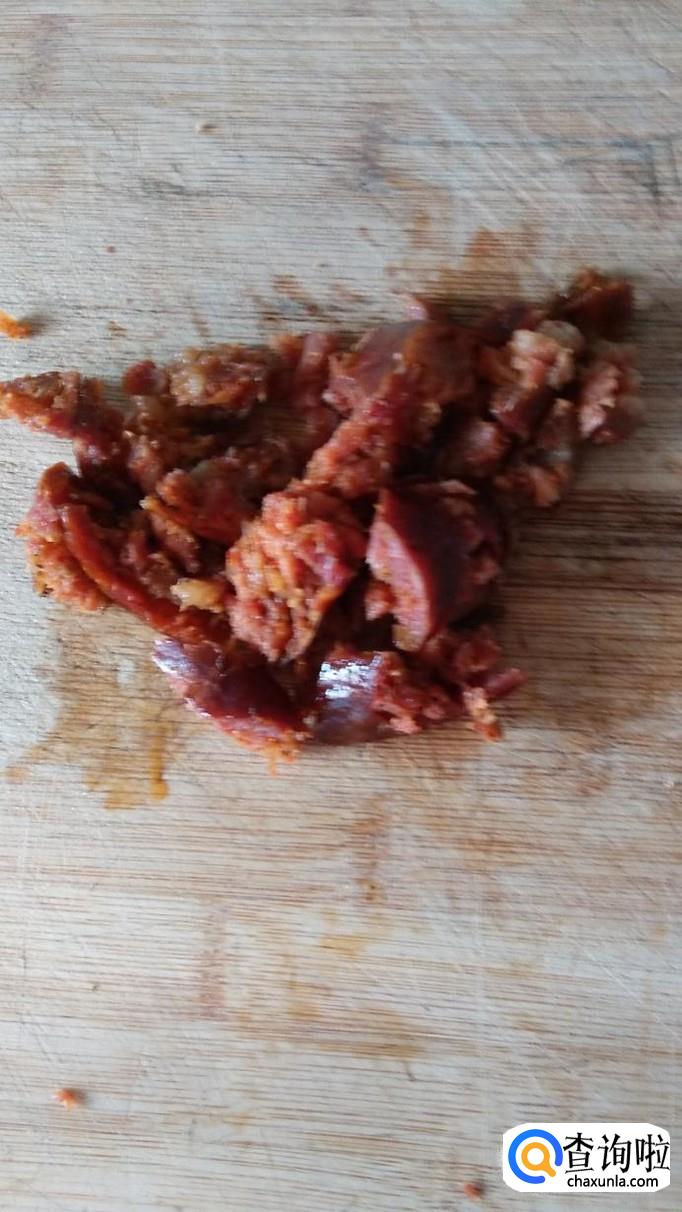 把腊肠或者腊肉切成碎粒,注意这里的腊肉和腊肠一定是事先煮熟过的,这样才能确保快速的入味,。如果你觉得不好切,就放在冰箱里冷藏一下,拿出来再切就会切得很完整了。