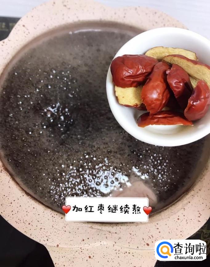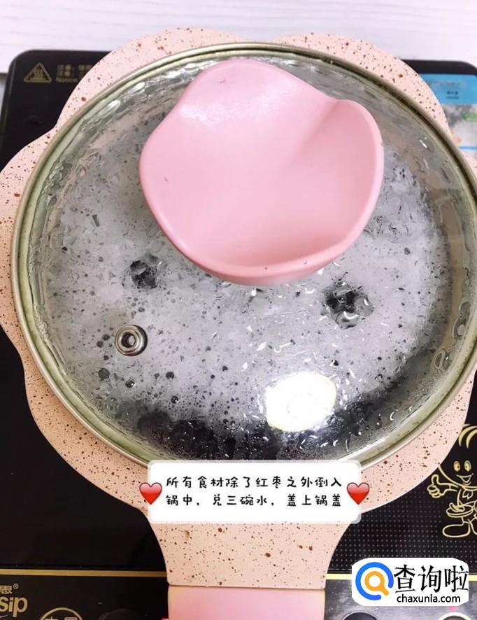 接着往锅中打入三碗清水,加入除红枣以外的所有食材,如下图所示。