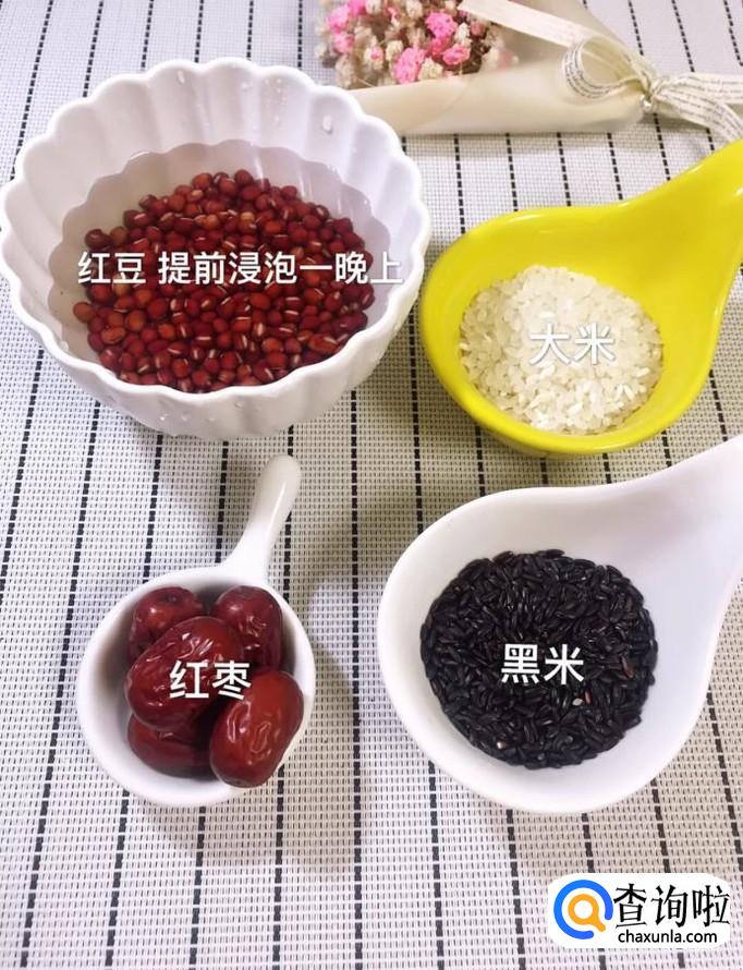 首先准备好所有要用到的食材,如下图所示。小贴士:红豆100克,黑米50克,大米50克,红枣五颗。