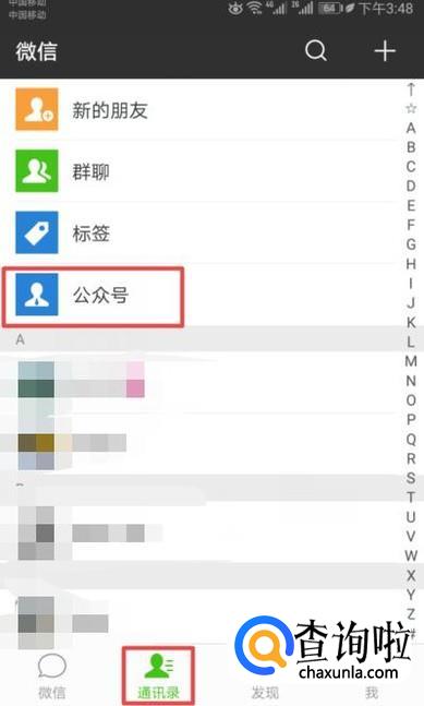 首先,我们打开我们的微信,然后我们点击通讯录,之后点击公众号;