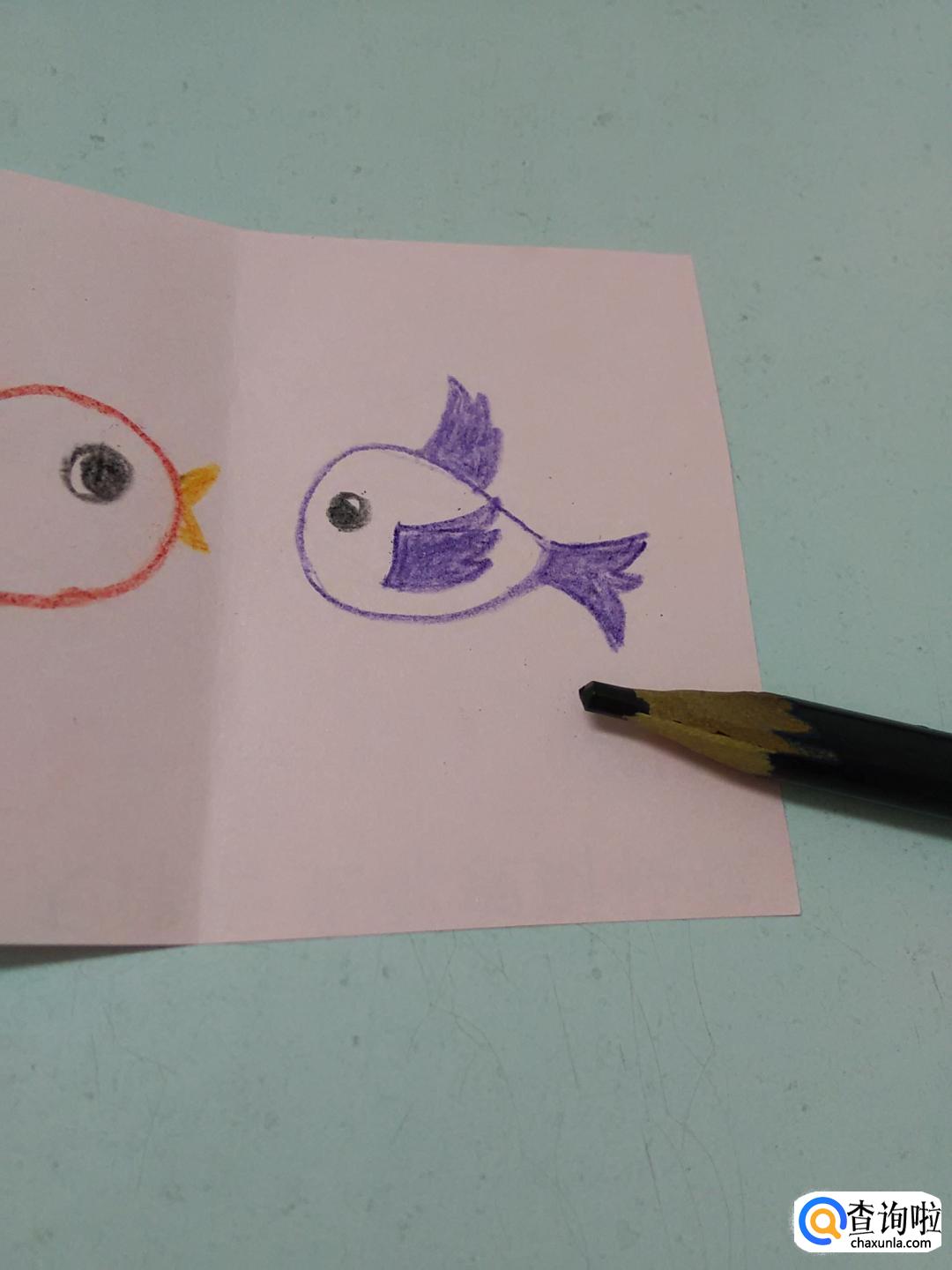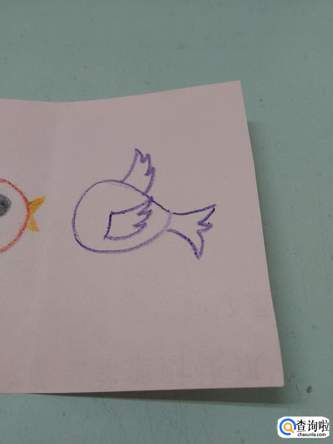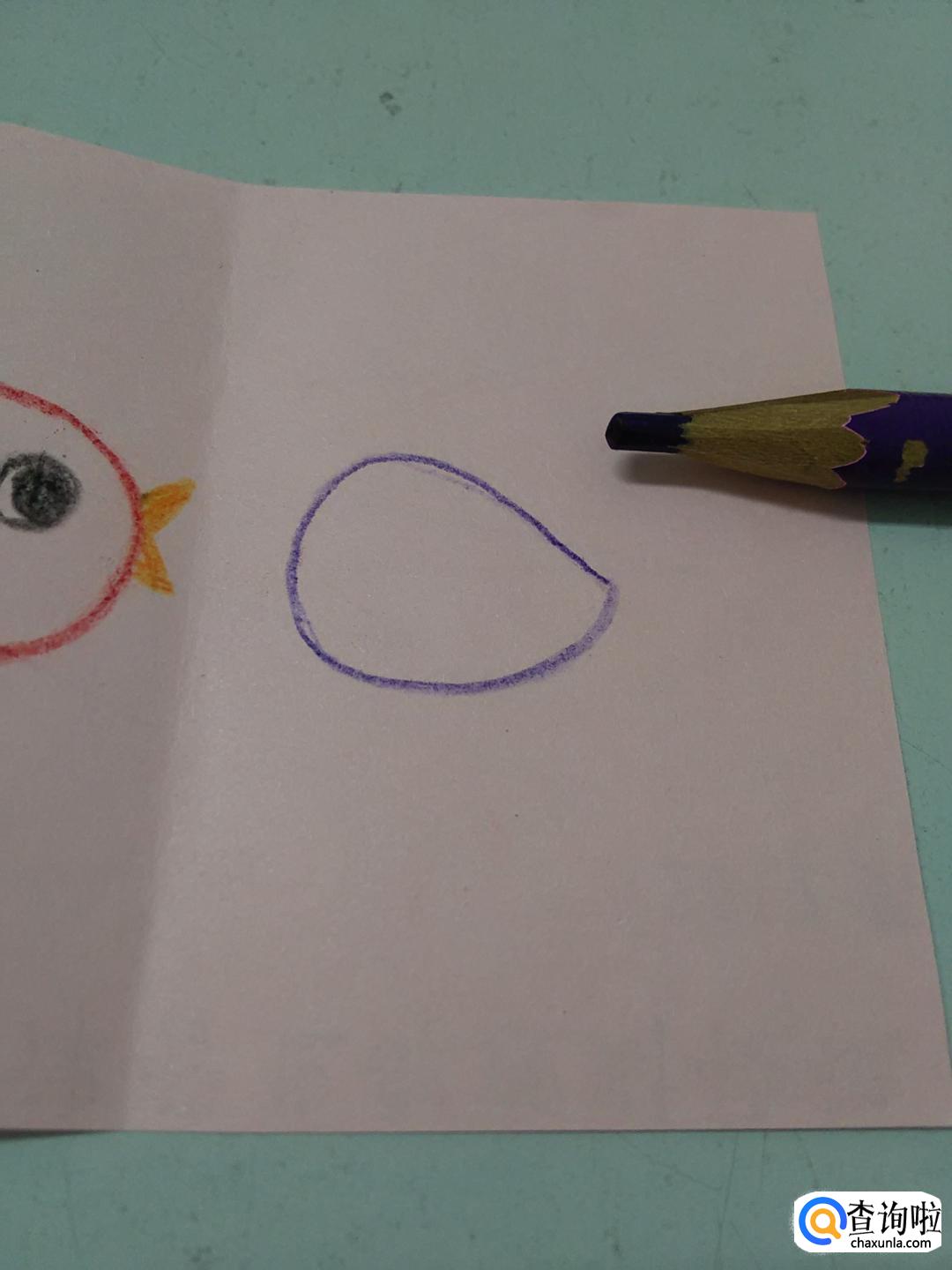 在彩纸右边,用紫色彩笔画一个水滴形状,表示另一只小鸟的身体。