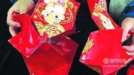再用四个红包,沿着折角钉成一圈,做出灯笼的上半部。