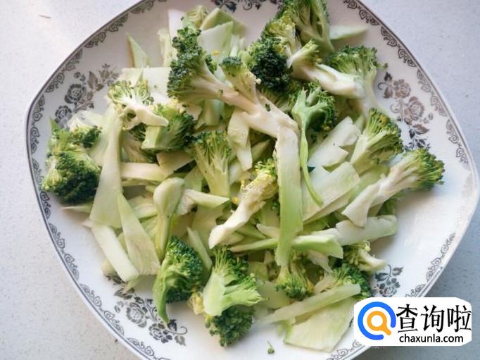 西兰花菜根用水清洗干净,控干水分,切成片。