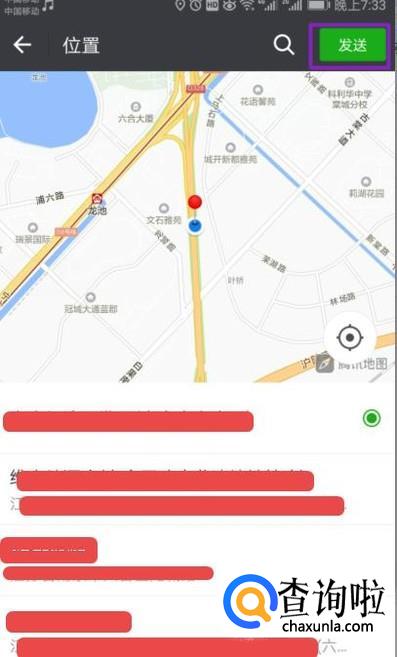之后就会弹出具体的位置,我们点击右上角的发送;