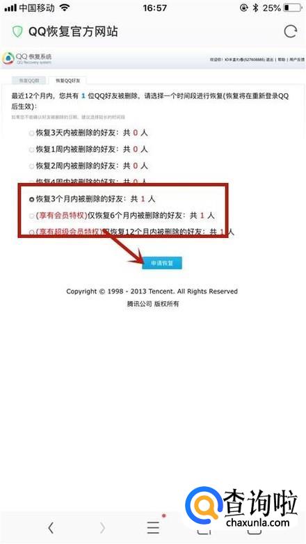 最后选择你要恢复的好友类型,并点击申请恢复就可以了。