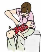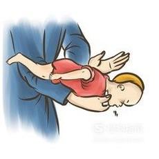 首先让婴儿脚朝着自己,头朝外地稍向下倾斜着放在自己的左腿上,用右手食指和中指快速冲击孩子上腹部。然后将孩子翻至自己的右腿上,用左手掌拍打孩子后背,也就是两侧肩胛骨之间。然后重复以上两个步骤,不停的冲击和拍打,直至他咳出异物。