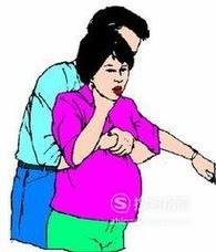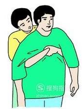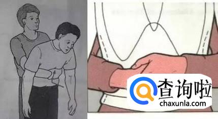 让患者坐着或站着,施救者从背后环抱住患者,一手握拳,一手抓住握住拳头的手,用力、快速地冲击患者腹部。此时患者应低头张嘴来配合施救者。