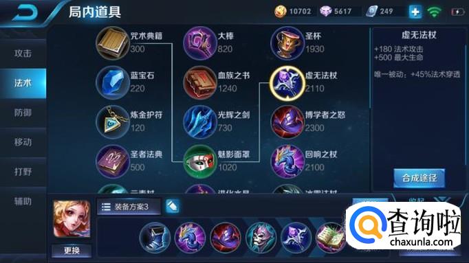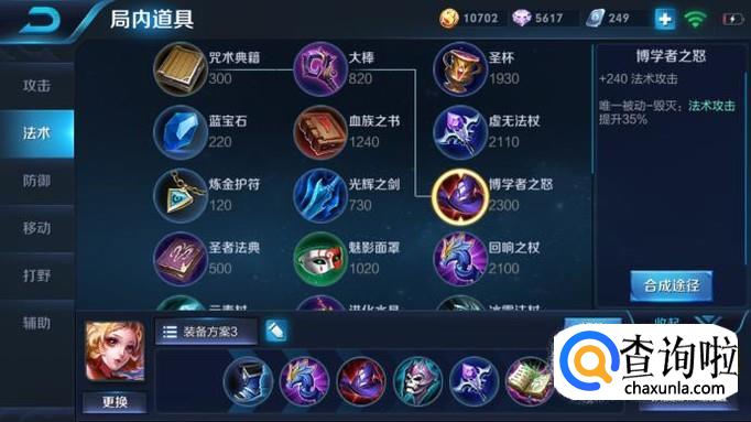 接下来的出装顺序依次为噬神之书-回响之杖-博学者之帽-梦魇之牙-贤者之书。之前的出装方案之所以没出噬神之书,是因为坦克并不能造成太多伤害并且铭文一般会带一些吸血,完全足够生存;这套出装方案带有吸血,让妲己更好的生存;梦魇之牙可以克制大多数射手的持续吸血效果,同时240的法强加成使妲己伤害依然不俗。