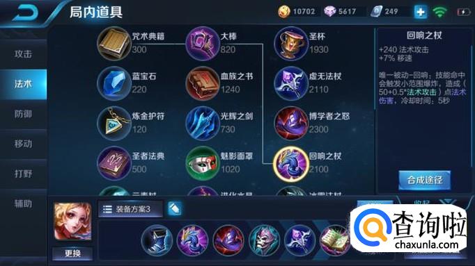 接下来买回响之杖,回响之杖可以增加240法强和移速增益,增加支援速度和机动性,重要的是被动的小范围爆炸效果,可以精确的使锁定敌人周围一圈敌人都收到伤害,在后期很爆炸;博学者之帽,增加240法强,被动直接增加35%的法强,让所有的法师的输出水平直接爆表。