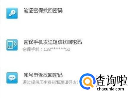 选择一种方式找回密码,第一种是填写密保问题正确后进行找回,第二种是发送短信到以前绑定的手机,第三种是提供历史材料和邀请好友来辅助进行申诉。