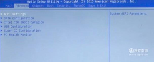 然后使用键盘上的上下左右按键移动到“Advanced”回车进入,然后再选择“SATA Configuration”,回车进入,如图: