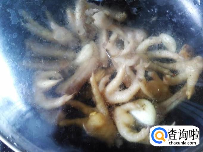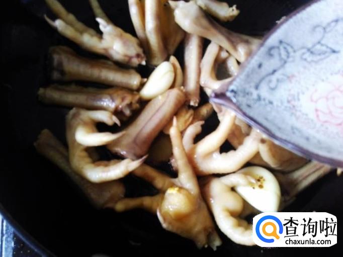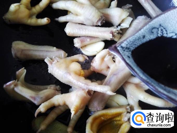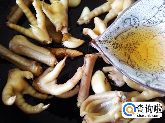 然后鸡脚回锅,下2勺生抽、1勺料酒。