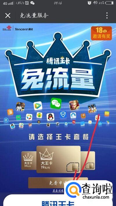 点击申请网卡,如图1箭头所示。会出现一个新的界面,如图2所示。在3张卡里选择一张卡(其实大王卡就够了)。再点击免费申请,如图2箭头所示。