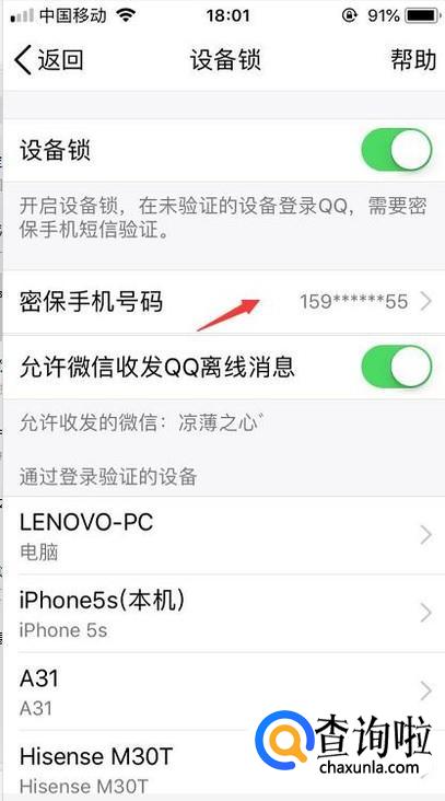 最后我们就能够看到该qq目前所使用的密保手机,点击一下。