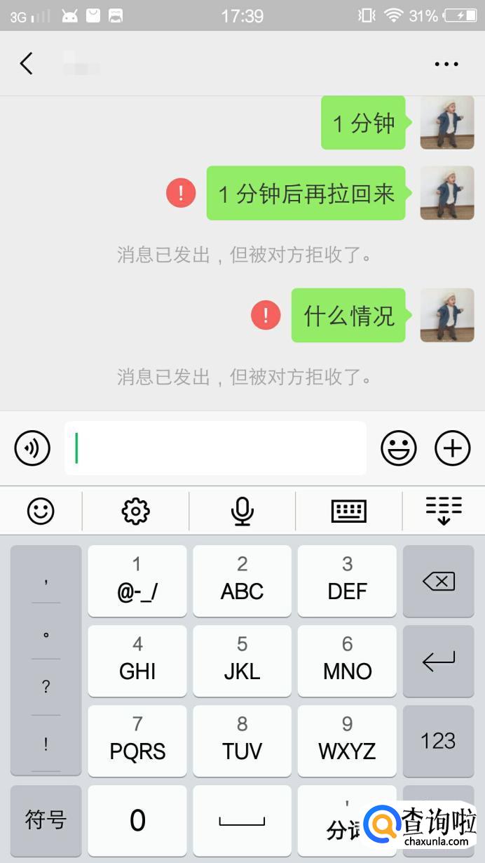 如果我们将对方拉黑,对方给你发消息的时候也会提示‘消息已发出,但被对方拒收’并加红色感叹号。