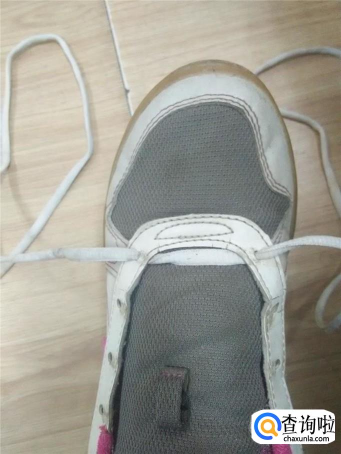 把鞋带抻出来后,两端再交叉,由内向外穿过第三排鞋眼。