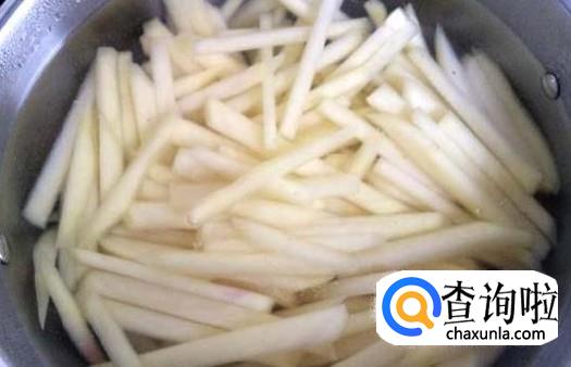 起锅烧水,水开后将土豆条放入煮熟。土豆条煮得脆些口感更好,在水复开后捞起即可。