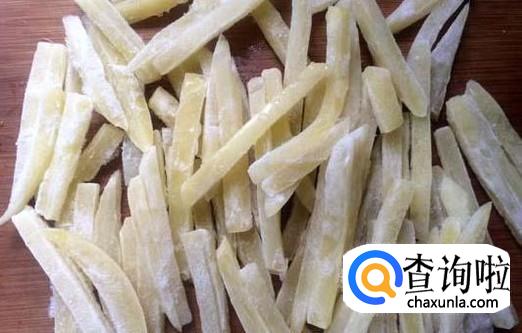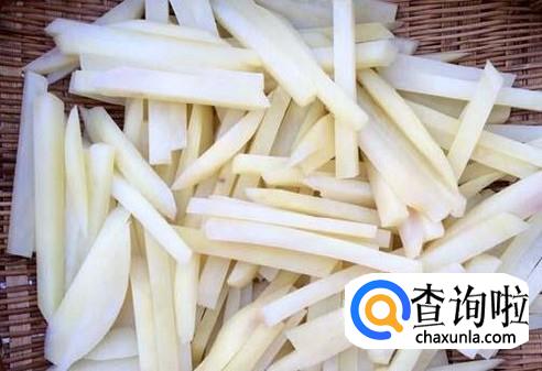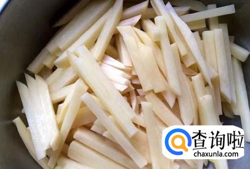 将土豆切成小指粗细,清水漂洗后,去掉土豆淀粉。