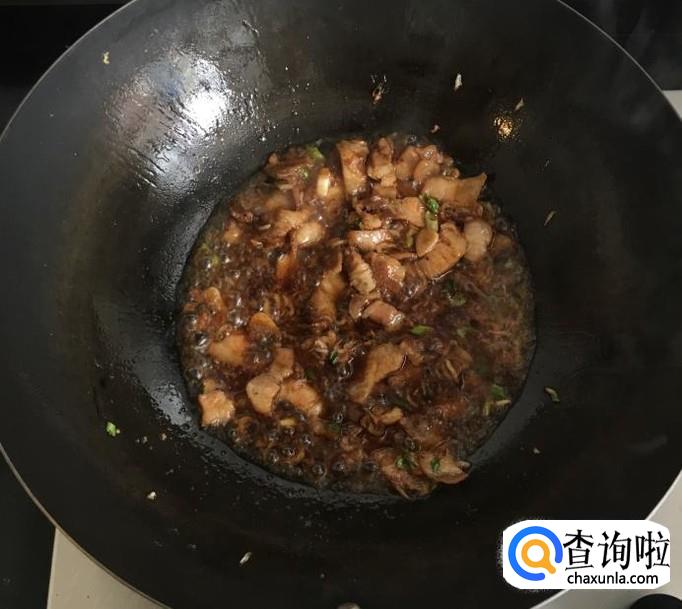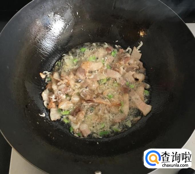 热锅加入适量的花生油放入五花肉片炒香并出油,放入虾皮、葱花、蒜片爆香,料酒、生抽烹锅。