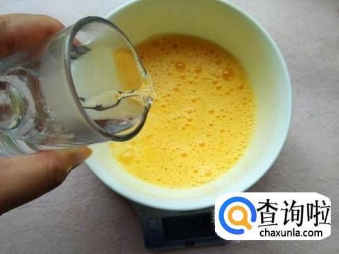 鸡蛋打好之后,往碗里加上适当清水,清水不要太多,鸡蛋液的三分之一就可以了,然后打散,把虾仁放进去。