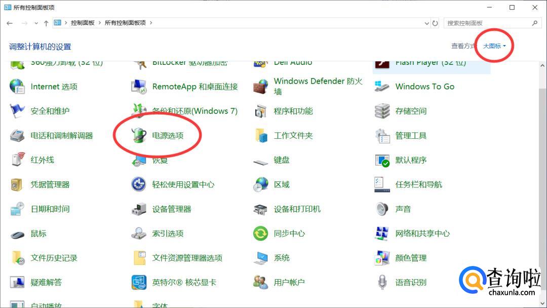 打开之后,先点击右上角的“查看方式”,选择“大图标”,之后再找到“电源选项”,并单击打开。