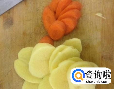 用刀将土豆和胡萝卜切成均匀的片。