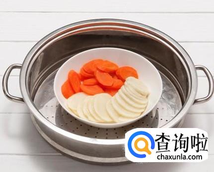 将切好的土豆和胡萝卜片放入碗中,隔水蒸熟,蒸得越烂越好。