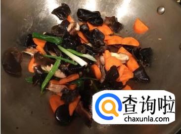 将木耳与胡萝卜放入油锅中翻炒1分钟,加蒜苗翻炒。