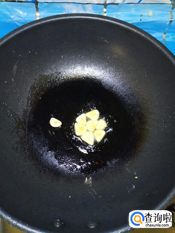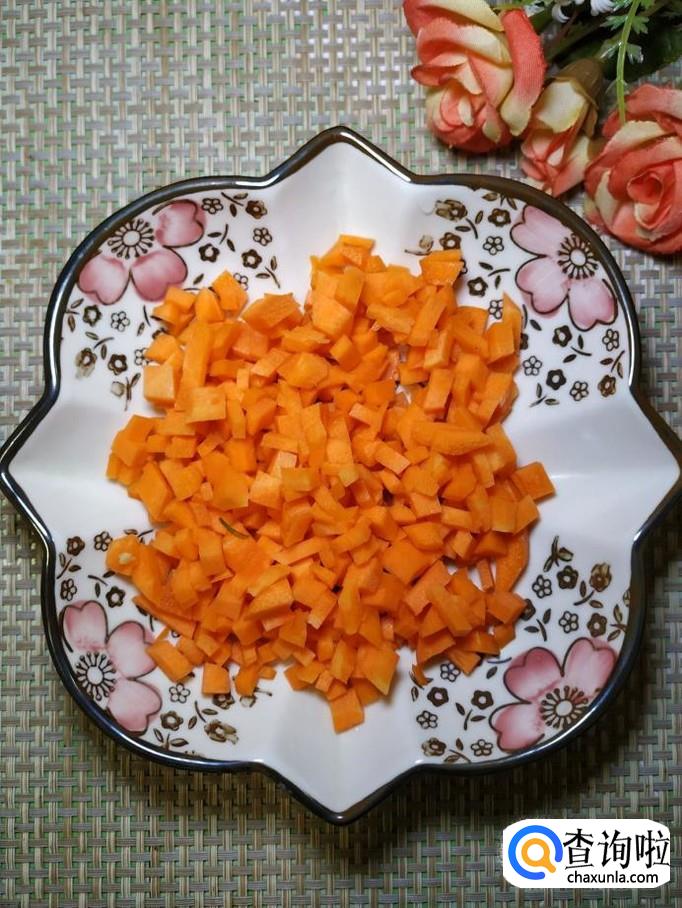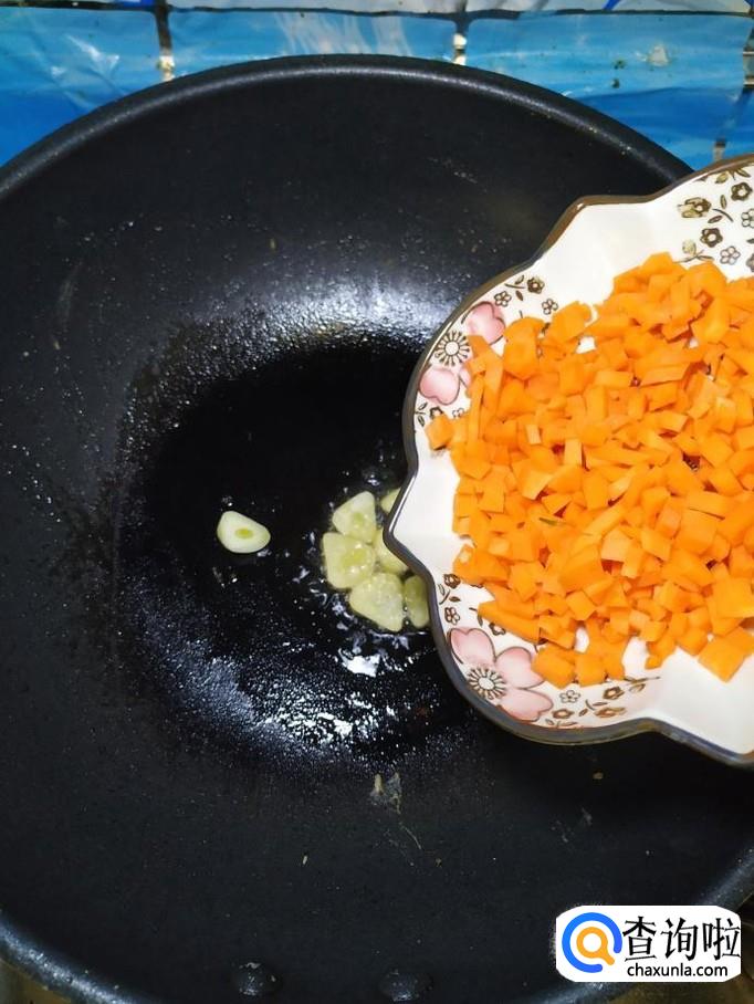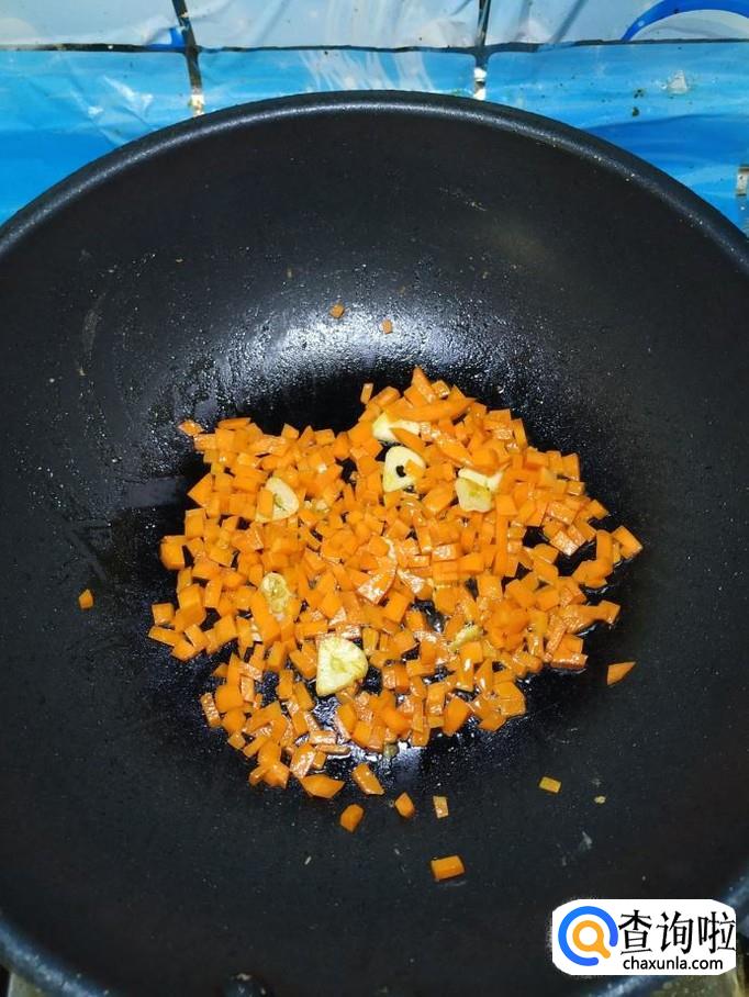 炒锅中放入适量油,油热后,将蒜片放入锅中炒香,然后将胡萝卜丁放入锅中,炒至胡萝卜丁变色。