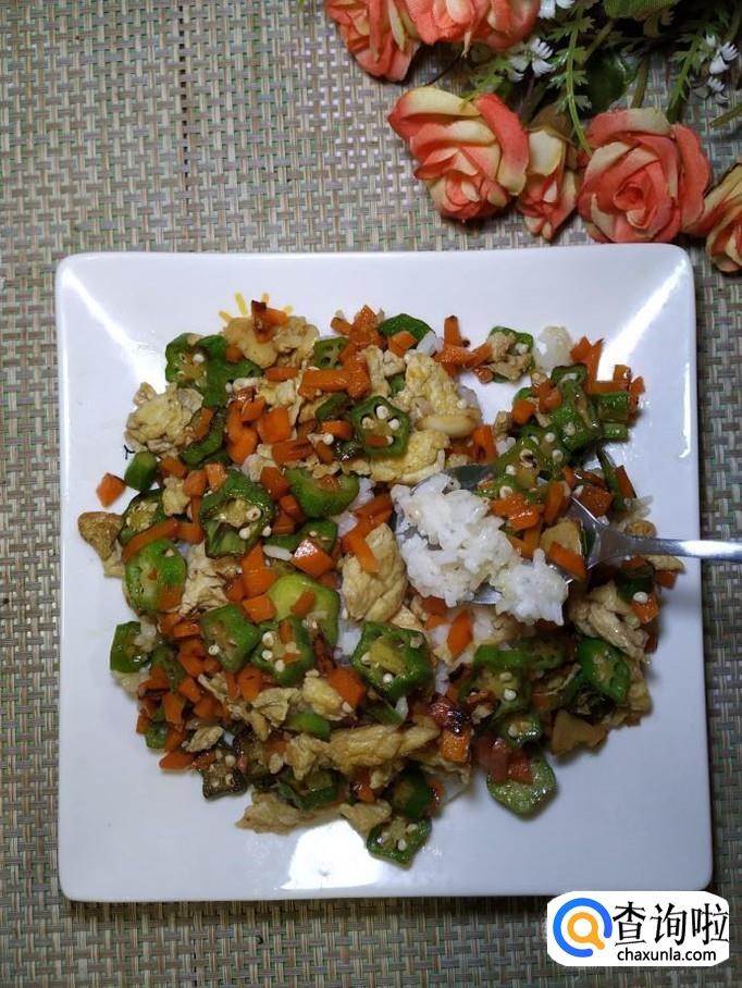 将蒸好的米饭盛出放入盘中,然后再将炒好的秋葵胡萝卜鸡蛋浇在上面,趁热就可以吃了,真的是太美味了,家里人都非常喜欢。