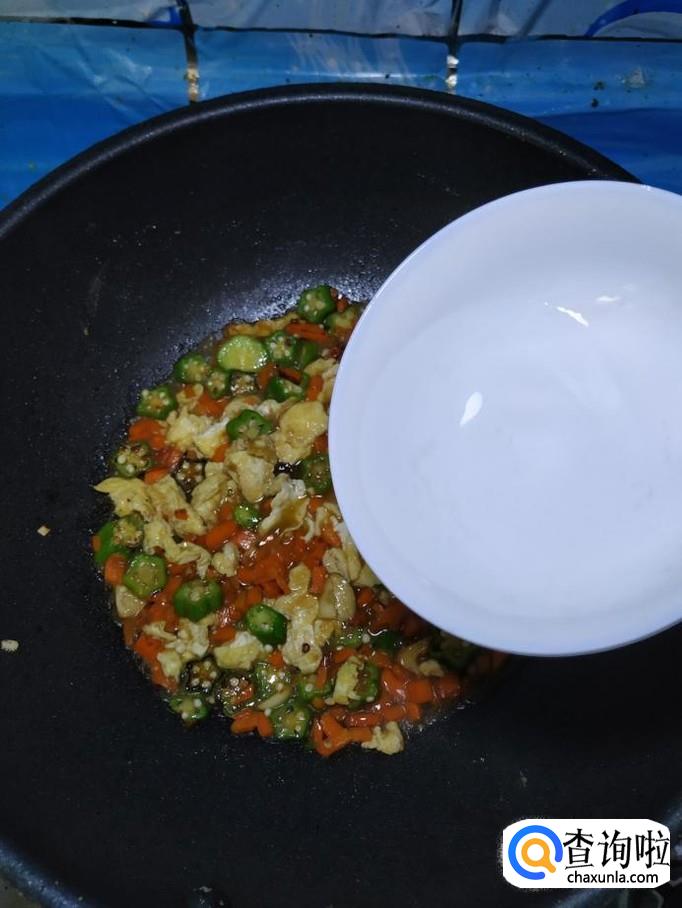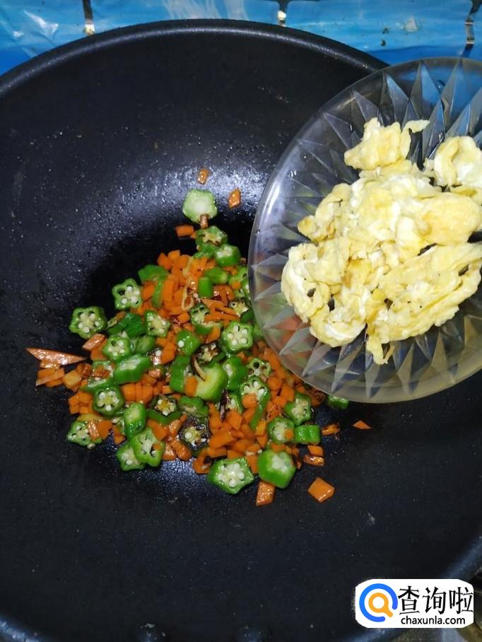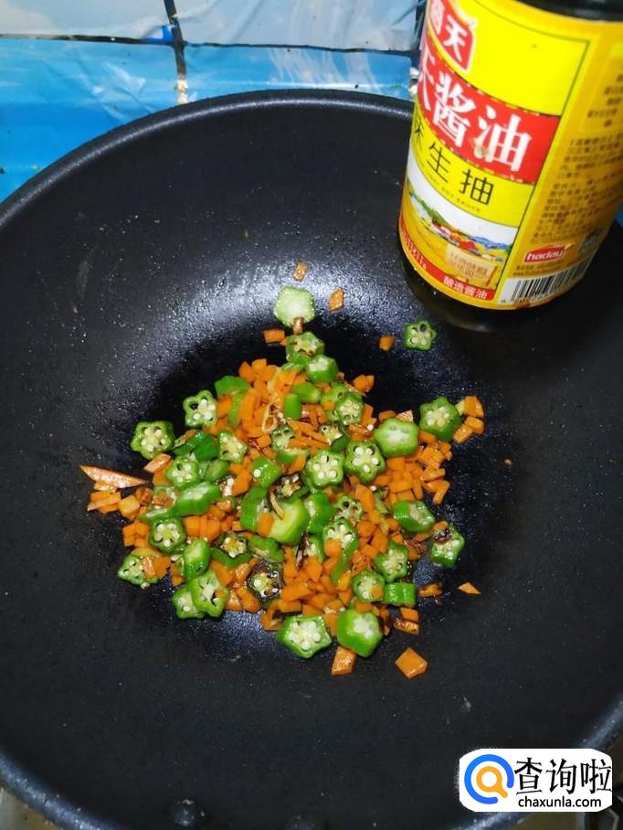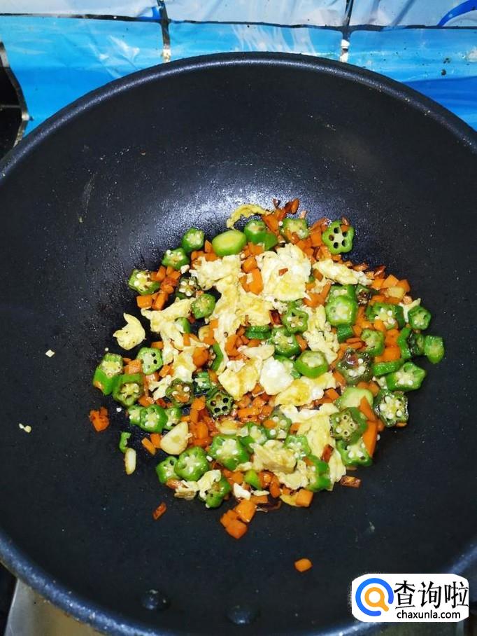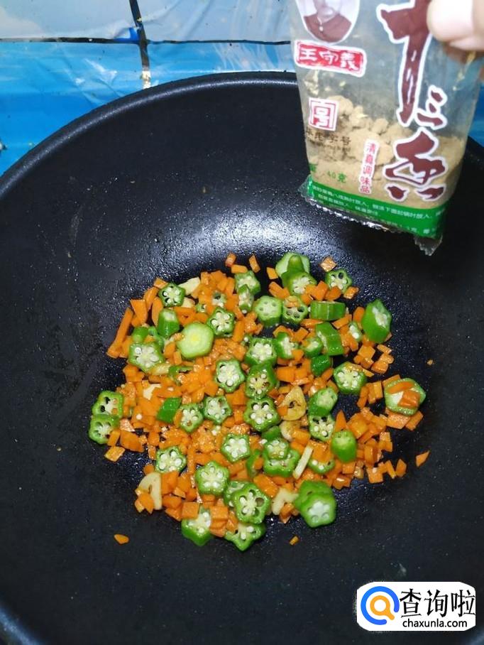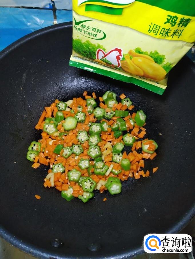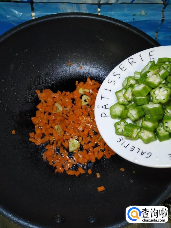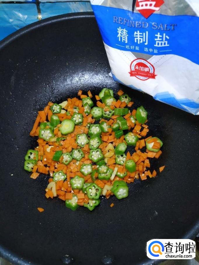 将切好的秋葵放入锅中,和胡萝卜丁一起翻炒均匀,然后加入适量食盐,食盐的量,可以根据个人口味进行添加。