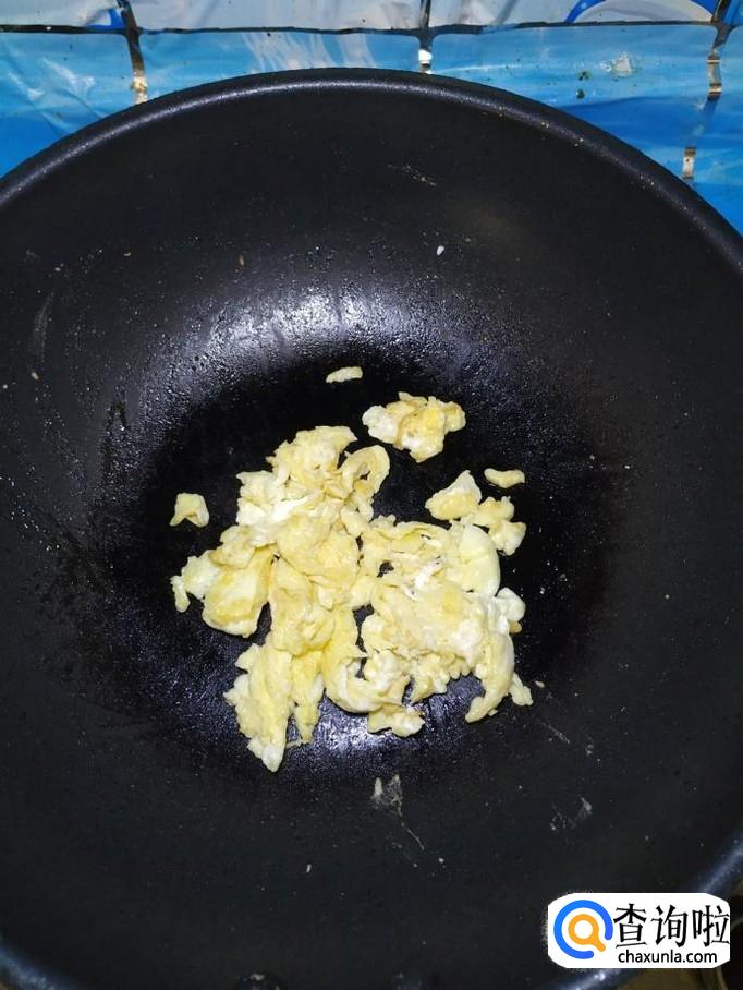 碗中打入一个鸡蛋,放入适量盐和料酒打散,炒锅中放入适量油,油热后,将鸡蛋放入锅中炒熟,盛出备用。