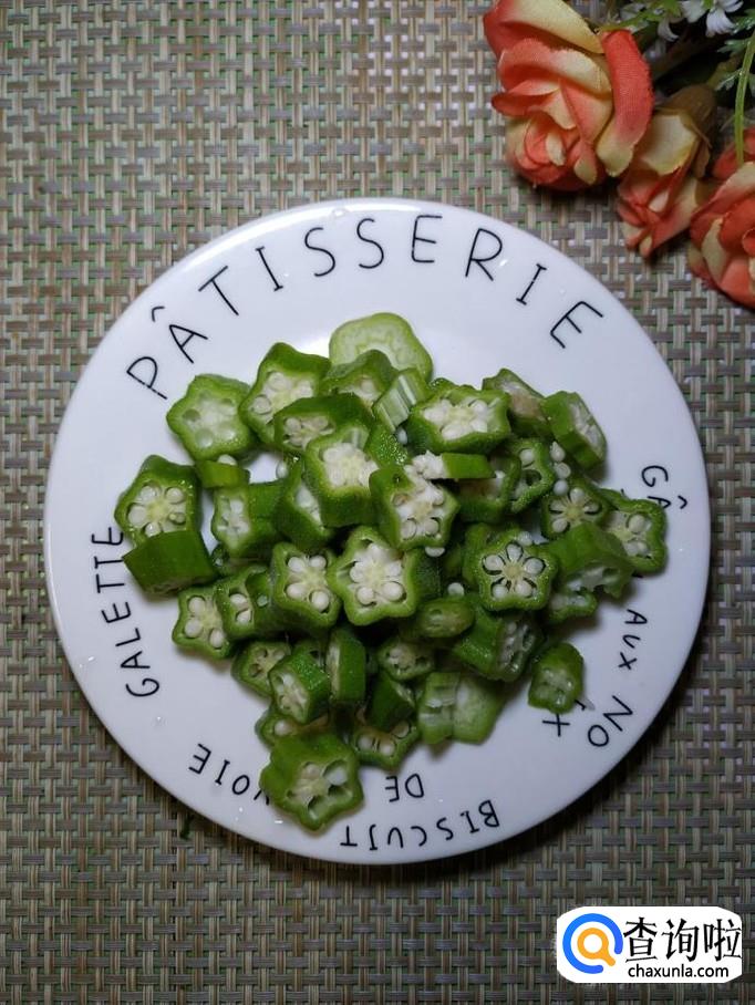 将秋葵切成小片,将胡萝卜去皮后切成丁,分别放入盘中备用。