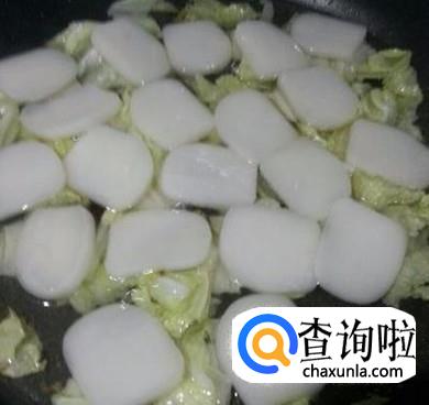 将年糕放入锅中翻炒,年糕后下锅,否则口感会比较硬