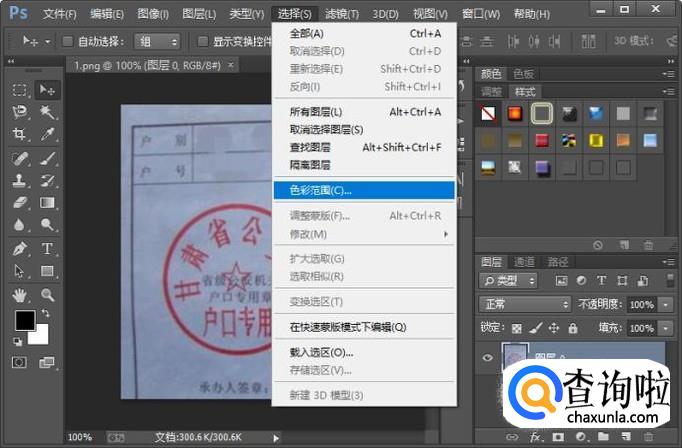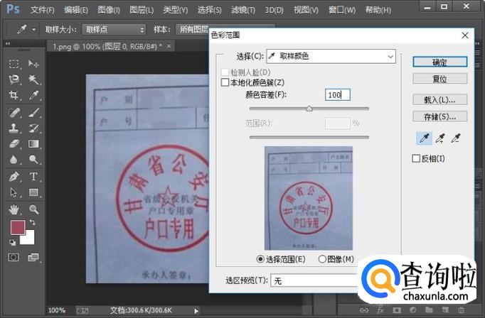 执行选择-色彩范围命令,使用吸管吸取红色公章的颜色区域。如果效果不是太明显的话,我们可以把颜色容差调大一些。