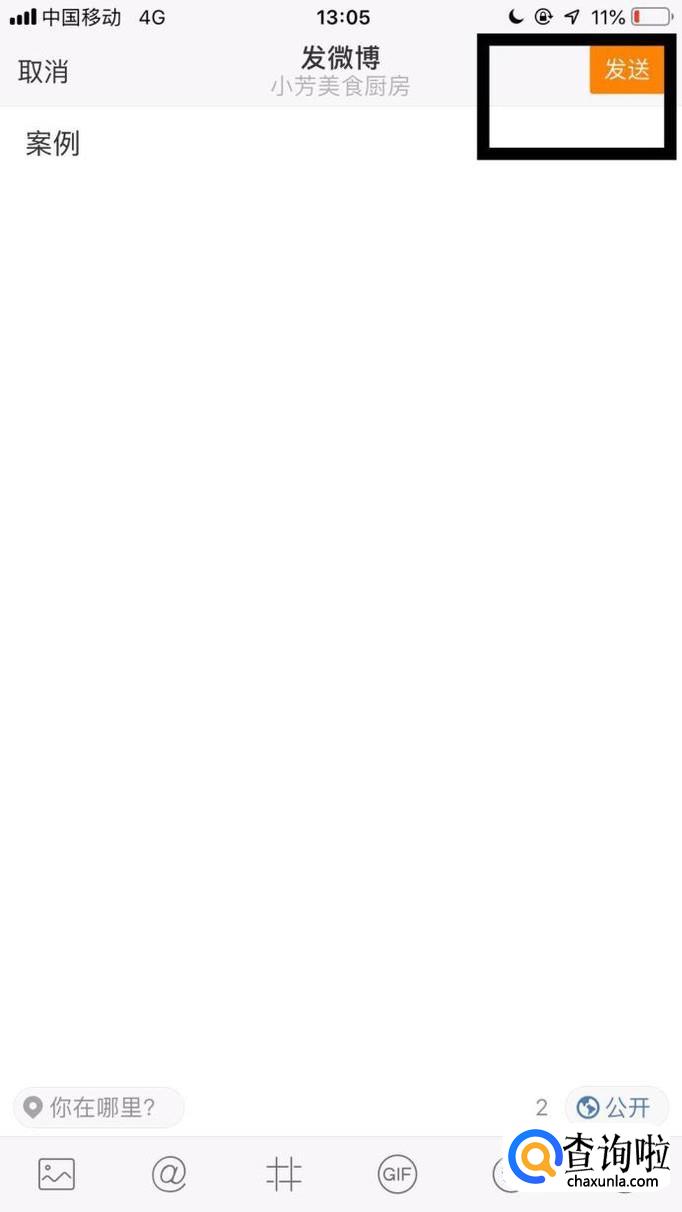 接着点击屏幕右下方的公开选择这条微博谁可以看。