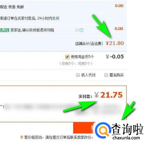 勾选使用淘金币抵钱后,即时,在店铺总计这里自动减去了淘金币抵扣的金额,显示为实付款;如图所示,我们核对无误后,再提交订单进行付款即可。