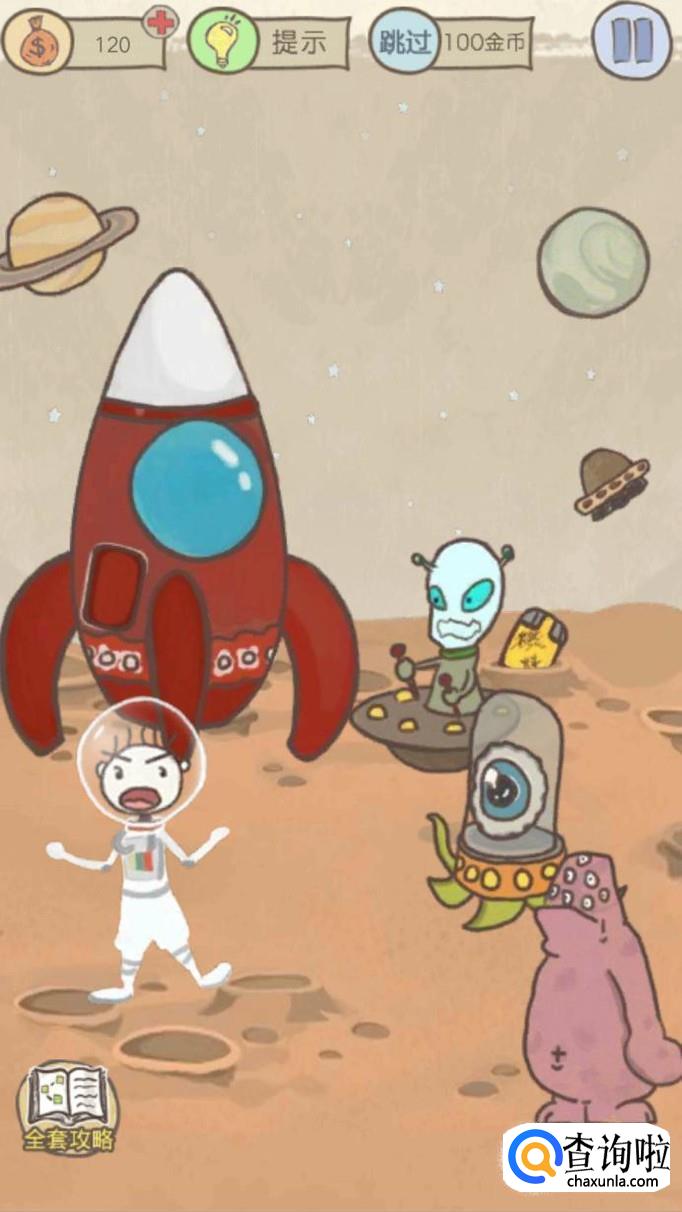 第三关:首先从左向右滑手机,就会从左边出来一个火箭,然后将外星人后面的燃料移到火箭上,史小坑就可以乘坐火箭逃走了。
