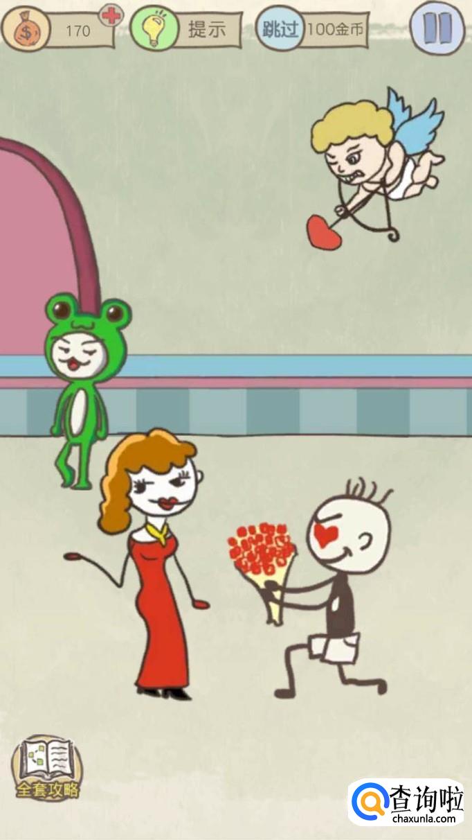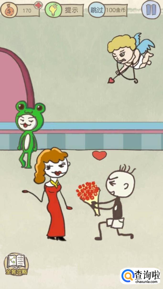 第八关:将史小坑与女神中间的爱心移到丘比特的箭上,然后点击女神,箭就会射出去,女神和史小坑就会相爱。