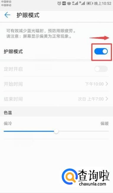 弹出的界面,我们将护眼模式的开关向右滑动打开就可以了。还是比较简单的,相信大家现在都会了。
