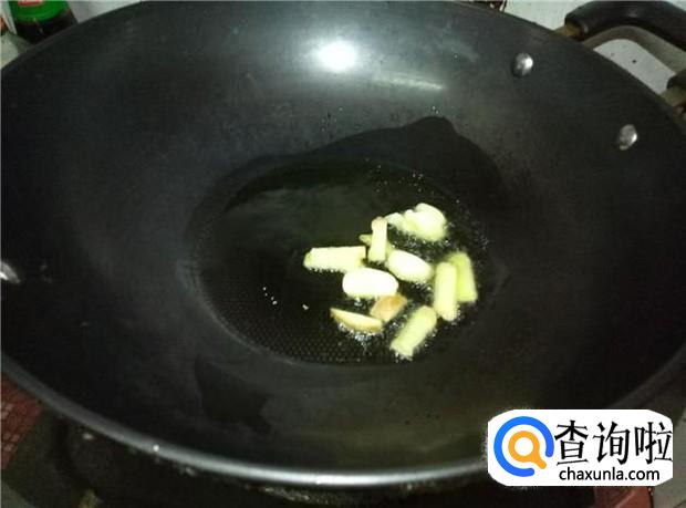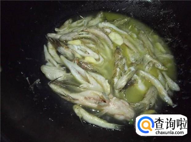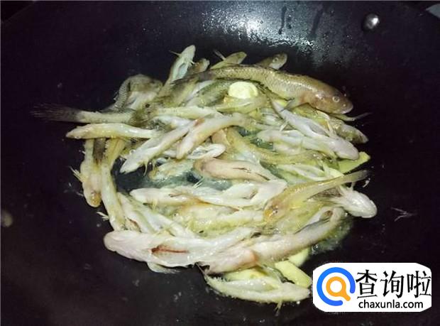 热锅下油,放入姜蒜煸香,再倒入腌制好的虾虎鱼。