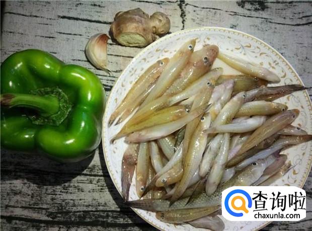 准备好所有原材料:虾虎鱼一斤、青色灯笼椒一个、蒜头两瓣、老姜适量。